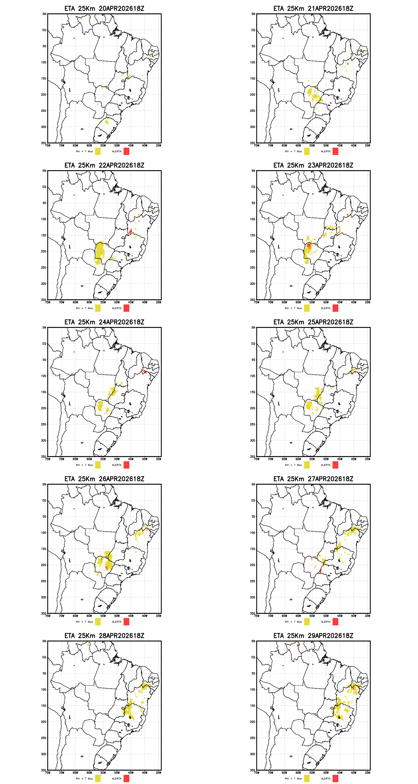 A área amarela do mapa indica as regiões onde, simultaneamente, a previsão aponta temperatura máxima superior a 30°C e umidade relativa inferior a 30%. A área vermelha destaca as regiões onde, além das duas condições anteriores, os ventos previstos superam 15 km/h, sendo estas as condições de maior risco de propagação de incêndios.