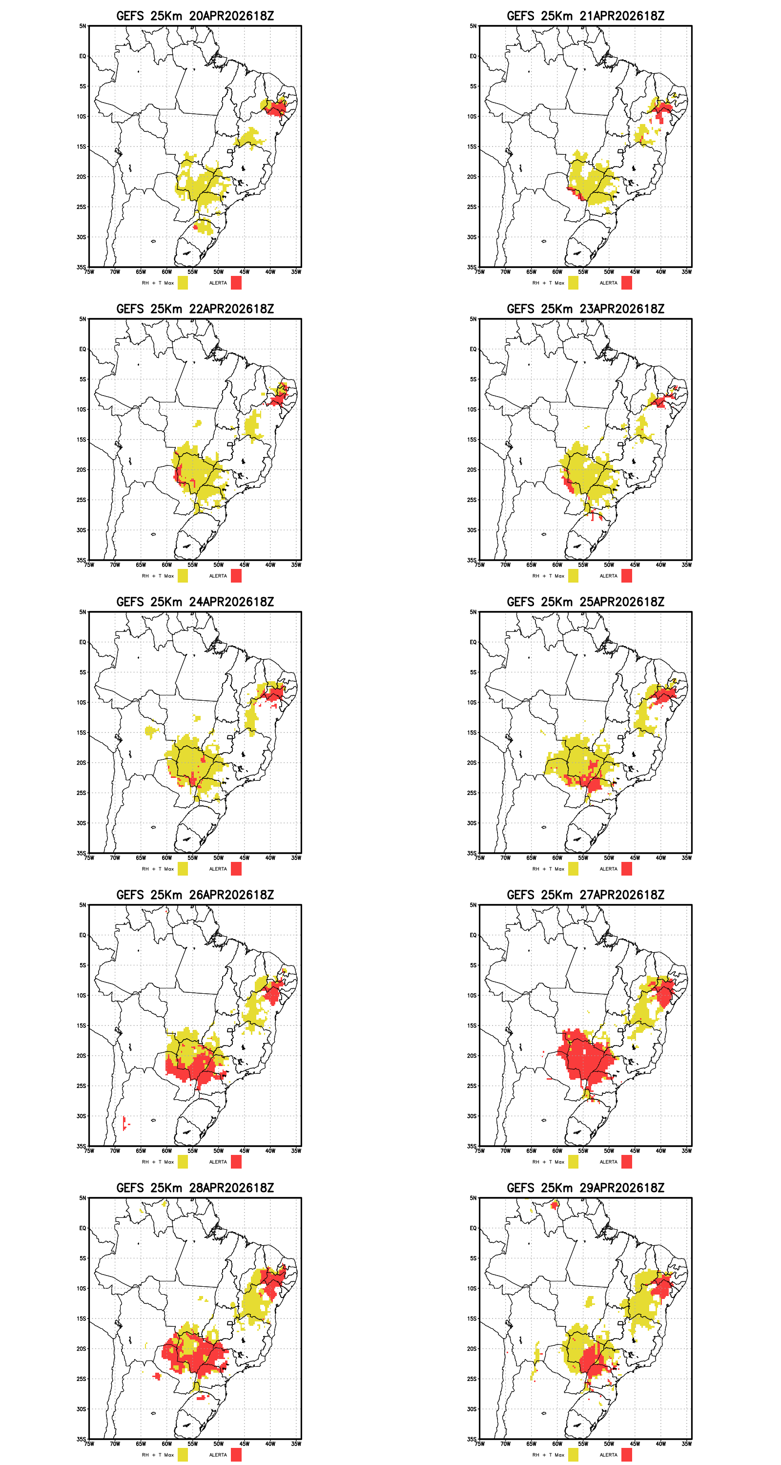 As figuras são elaboradas a partir das previsões meteorológicas derivadas do modelo global de previsão por conjuntos, o Global Ensemble Forecast System (GEFS/NOAA), com resolução espacial de 25 km) e do modelo regional Eta (CPTEC/INPE), com resolução espacial de 8 km.